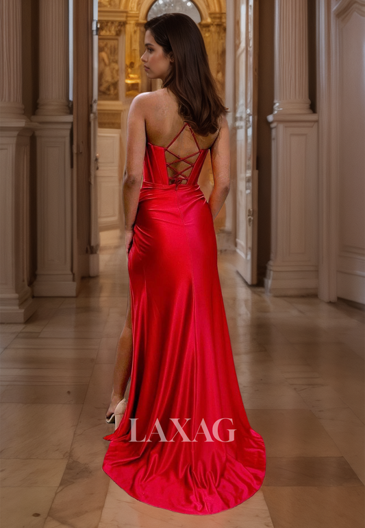 Spaghetti Straps Sweetheart Pleated Satin Mermaid Prom Dress Sequined Party Gowns with High Slit