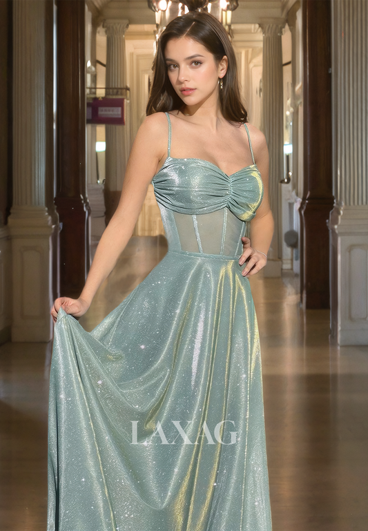 فستان سهرة بدون أكمام بقصة قلب وحمالات رفيعة، مزين بثنيات لامعة، بتصميم حرف A
