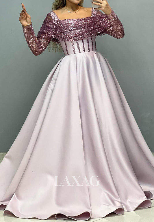 فستان حفلات طويل الأكمام بياقة مربعة وقصة حرف A، مزين بالترتر والدانتيل اللامع، بطول الأرض