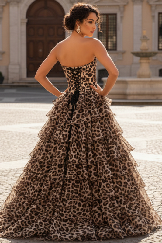 Sweetheart Sleeveless Applique Leopard Print Chiffon Pleated Ruffled Tiered A-Line Prom Dress