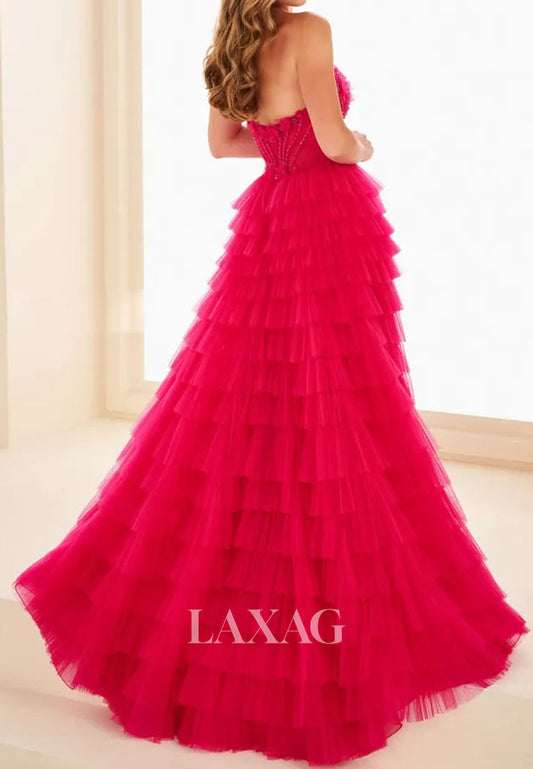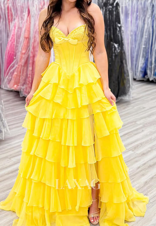 Sweetheart Sleeveless Beaded Chiffon Pleated Ruffled Tiered A-Line Prom Dress with High Slit