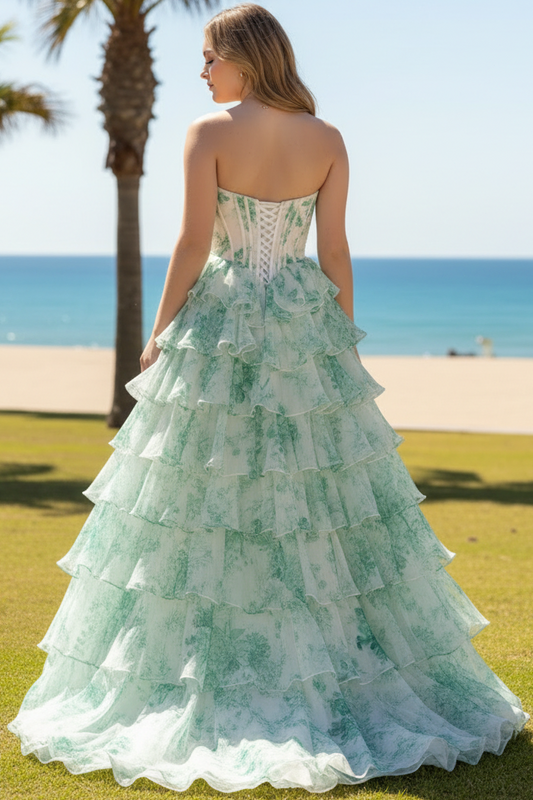 Sweetheart Sleeveless Floor-Length Print-Chiffon Pleated Tiered Long Fitted Prom Dress