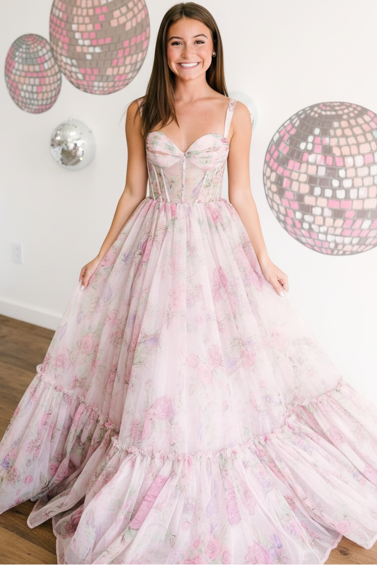 Make a stunning entrance in this elegant chiffon prom dress designed to turn heads. The romantic floral print adds timeless sophistication, while the flattering A-line silhouette gracefully skims your figure. Delicate spaghetti straps and a sweetheart neckline create an effortlessly chic look that works for proms, galas, and special occasions. Crafted from flowing chiffon fabric, this floor-length gown moves beautifully with every step, ensuring you feel confident and radiant all night long. Perfect for creating unforgettable memories in style.