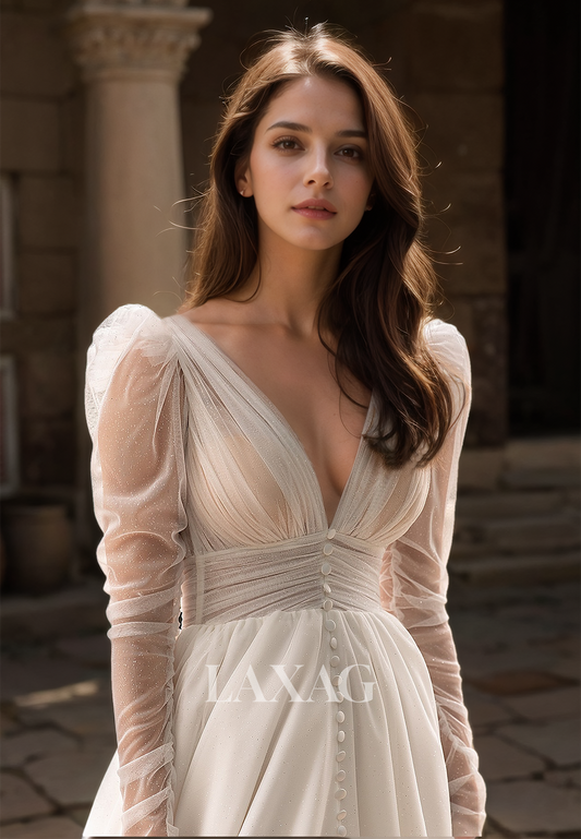 فستان زفاف من الدانتيل بفتحة رقبة على شكل حرف V وأكمام طويلة وفتحة عالية وذيل شفاف مطوي