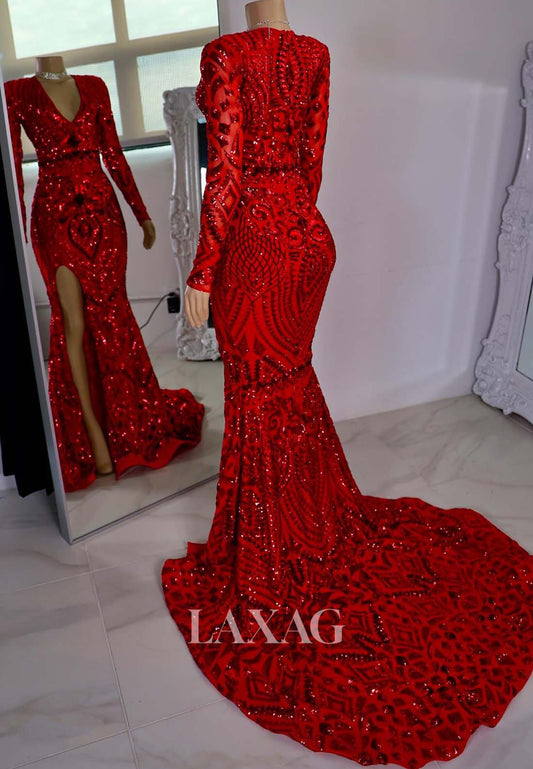 فستان حورية البحر للحفلات الراقصة بفتحة رقبة على شكل حرف V وأكمام طويلة وترتر بالكامل وفتحة عالية وذيل طويل للفتيات ذوات البشرة السمراء