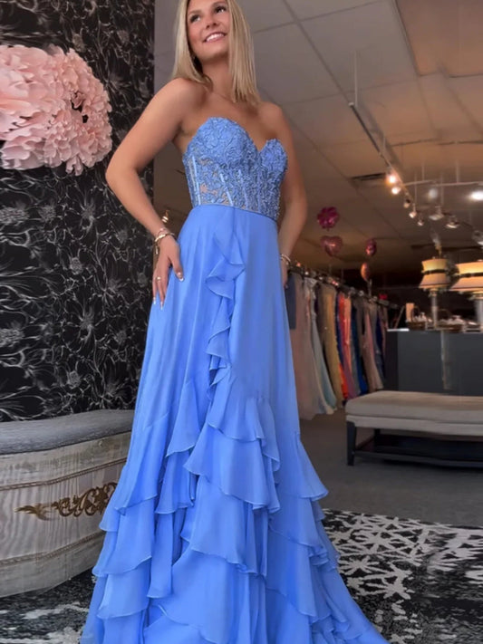 A-Line Sweetheart Sleeveless Beaded Applique Chiffon Pleated Tiered Long Prom Dress