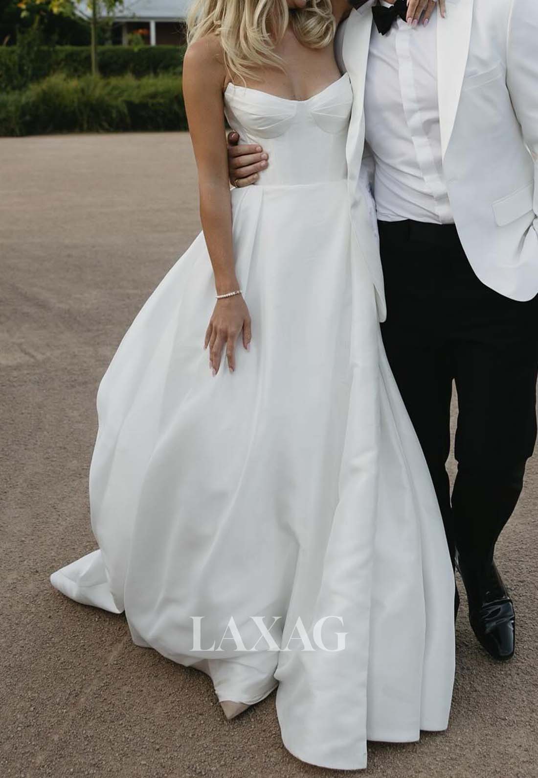 فستان زفاف بسيط من الساتان المطوي بفتحة رقبة على شكل حرف V وحمالات رفيعة بدون أكمام وذيل طويل