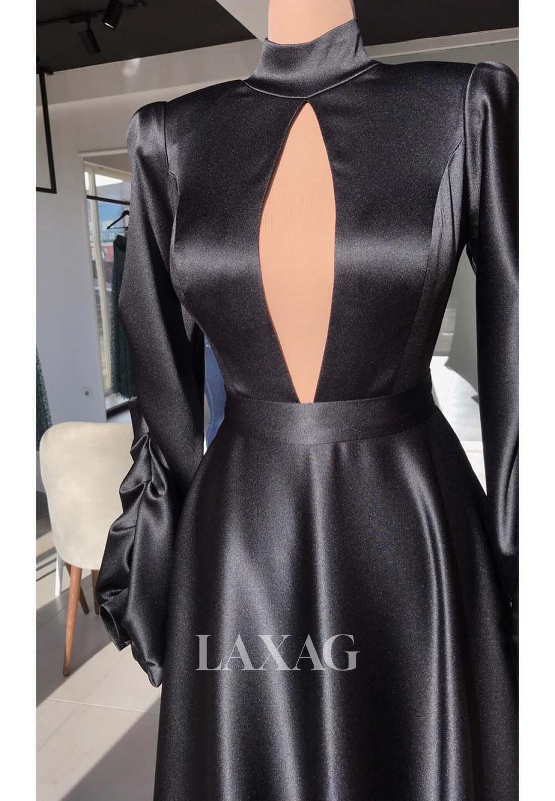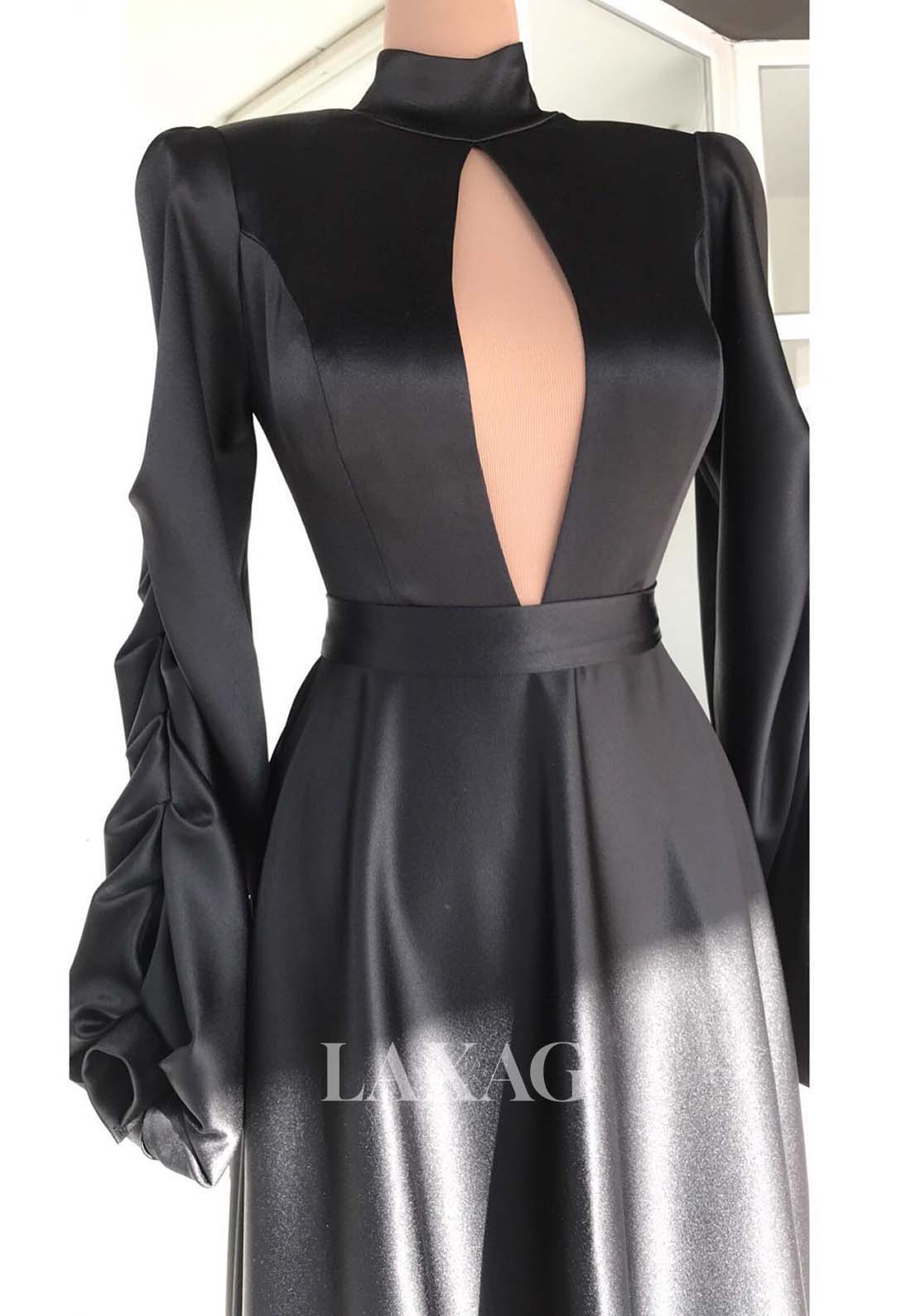 فستان سهرة بسيط، بأكمام طويلة ورقبة عالية، من الساتان، بتصميم مطوي، وفساتين رسمية