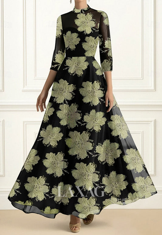 High-Neck 3/4-Sleeves Formal Gowns Jacquard Tulle Floor-Length A-Line Evening Dress