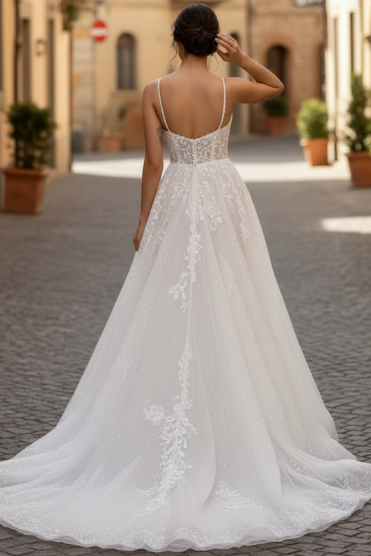 Scoop-Neck Spaghetti Straps Floral Embellished Applique Tulle A-Line Wedding Dress