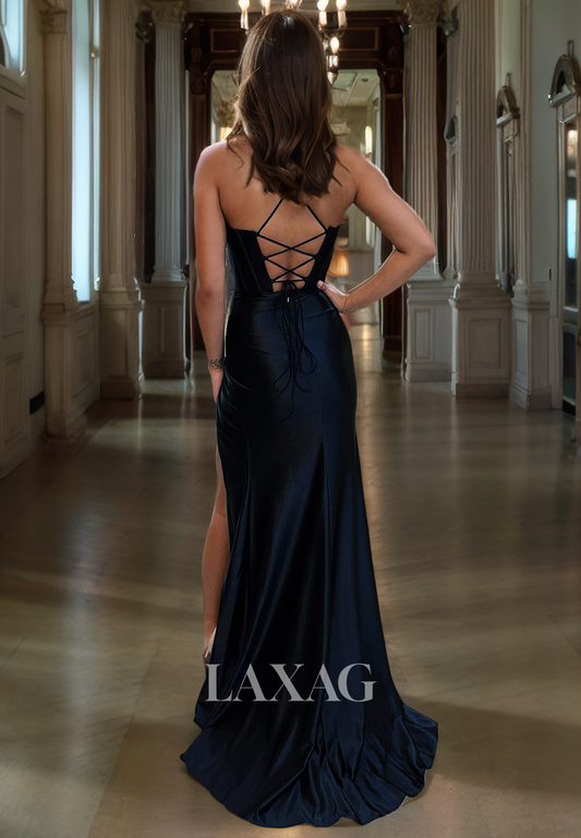 Spaghetti Straps Backless High Slit Satin Party Gowns Sweetheart Off-Shoulder Pleated Prom Dress