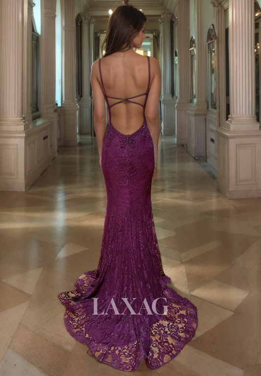 Spaghetti Straps Deep V-Neck Lace Mermaid Prom Dress Sleeveless Beaded Applique Party Gowns with Train