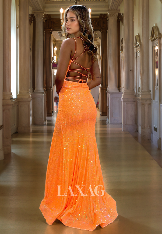 Spaghetti Straps Backless Sequins High Slit Party Prom Formal Evening Dress