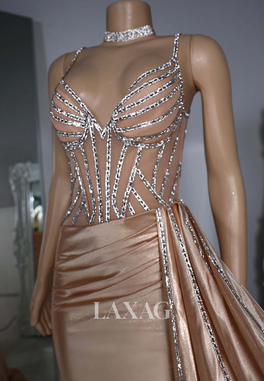 Spaghetti Straps Deep V-Neck Mermaid Prom Dress Sleeveless Beaded Floor-Length Party Gowns