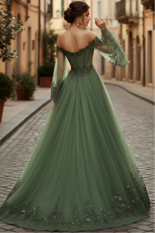 V-Neck Off-Shoulder Long-Sleeves Satin&Chiffon Pleated Ankle-Length A-Line Evening Dress