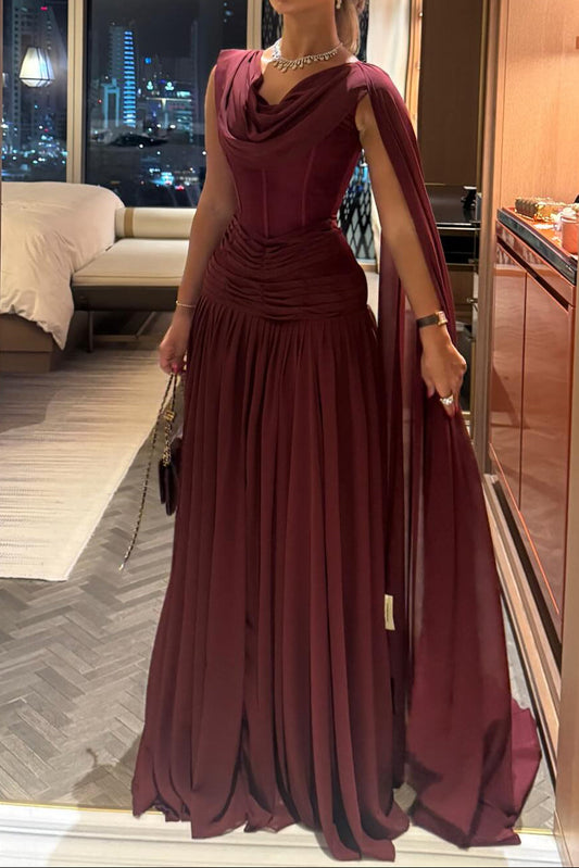 A-Line Scoop-Neck Off-Shoulder Sleeveless Pleated Chiffon Floor-Length Formal Evening Dress