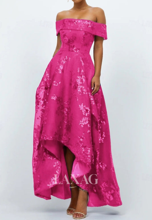 Bateau-Neck Sleeveless Fully Sequined Tulle Pleated High-Low A-Line Evening Dress