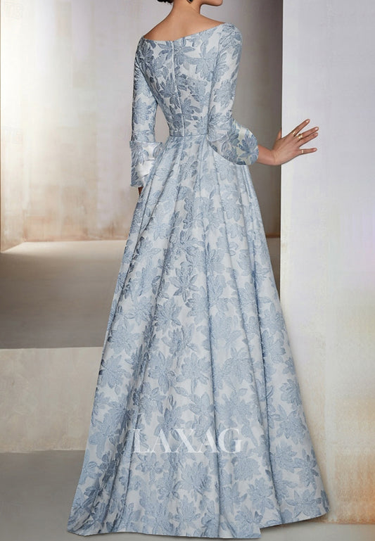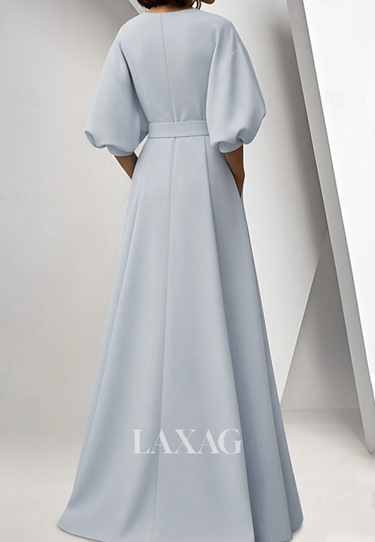 V-Neck 3/4-Sleeves Jacquard Satin Pleated Floor-Length A-Line Evening Dress with High Slit