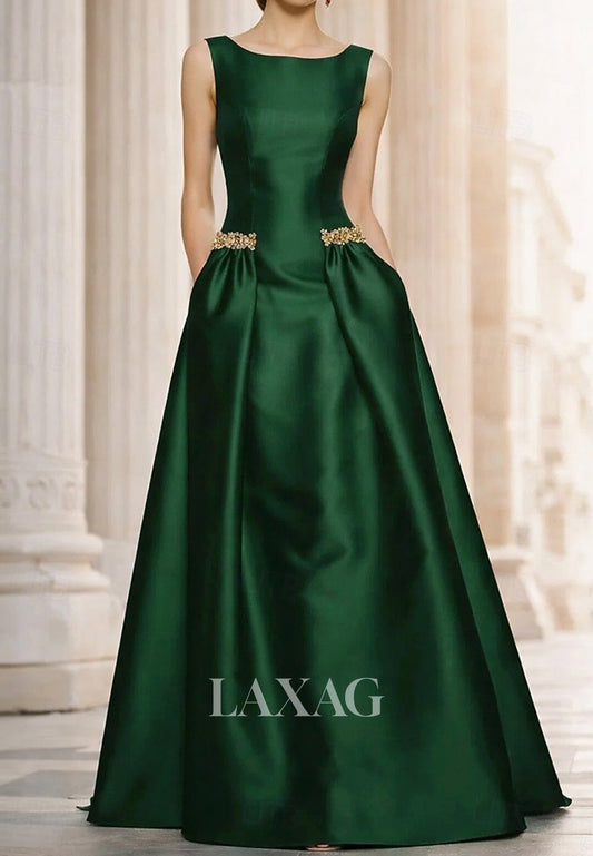 Scoop-Neck Straps Sleeveless Beaded Satin Pleated Floor-Length Simple A-Line Evening Dress