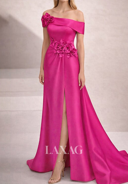 Off-Shoulder Sweetheart Applique Satin Floor-Length Mermaid Prom Dress with High Slit