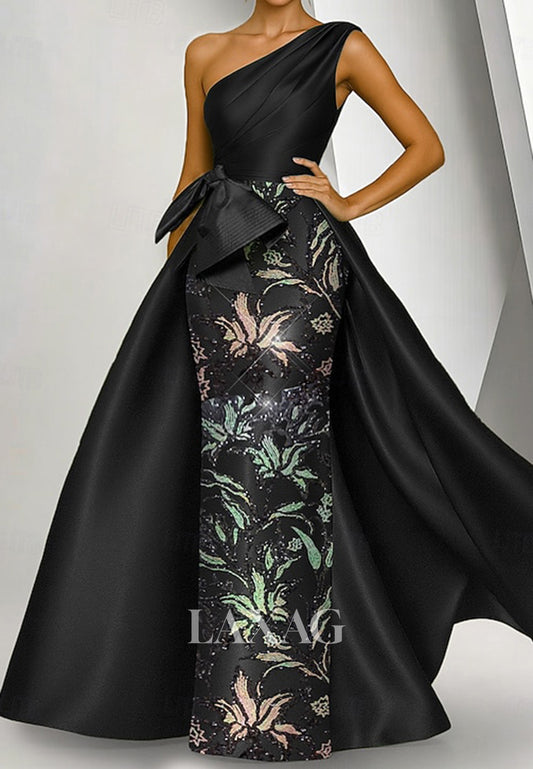 Asymmetrical-Neck One-Strap Sequined Applique Satin Pleated Floor-Length Mermaid Evening Dress