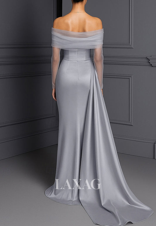 Scoop-Neck Off-Shoulder Long-Sleeves Satin Pleated Floor-Length Simple A-Line Evening Dress
