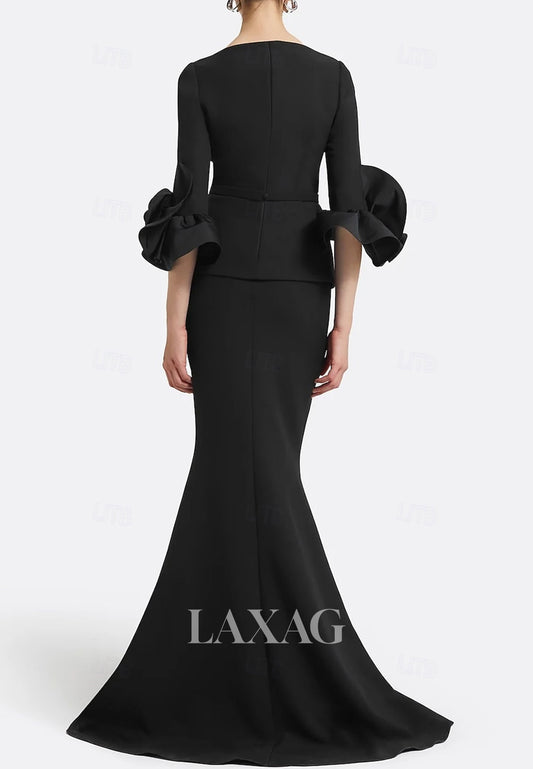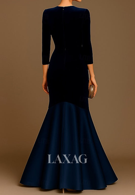 V-Neck 3/4-Sleeves Floor-Length Velvet&Satin Simple Trumpet Mermaid Evening Dress