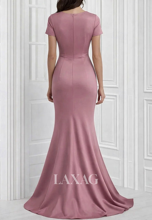 V-Neck Half-Sleeves Ruffled Satin Floor-Length Simple Mermaid Evening Dress with Sweep Train