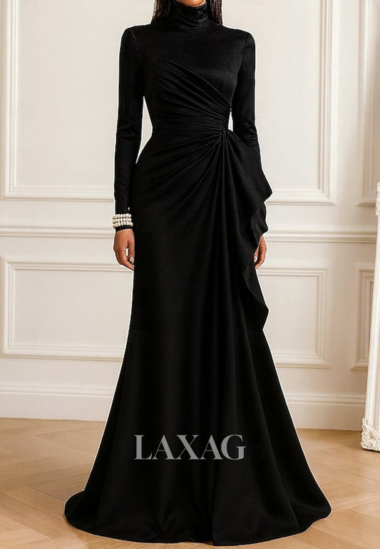 High-Neck Long-Sleeves Ruffled Satin Pleated Floor-Length Simple Mermaid Evening Dress