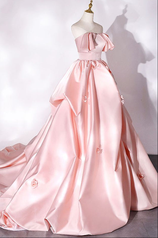 A-Line Tube Top Sleeveless Floral Embellished Satin Pleated A-Line Prom Dress with Train