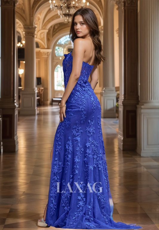 One-Floral-Straps Off-Shoulder Sleeveless Mermaid Prom Dress Sweetheart Lace Applique Pleated Formal Gowns