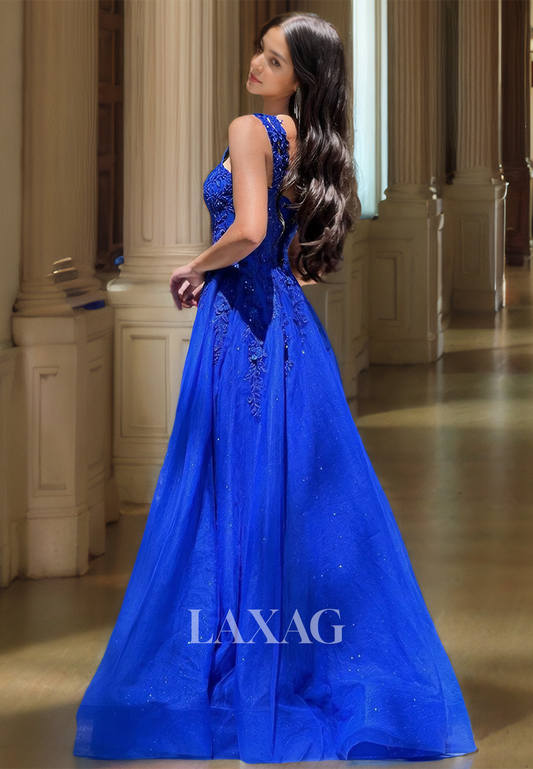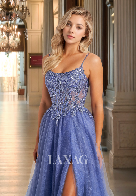 Scoop-Neck Spaghetti Straps Sleeveless Applique Party Dress Beaded Pleated High Slit A-Line Prom Gowns