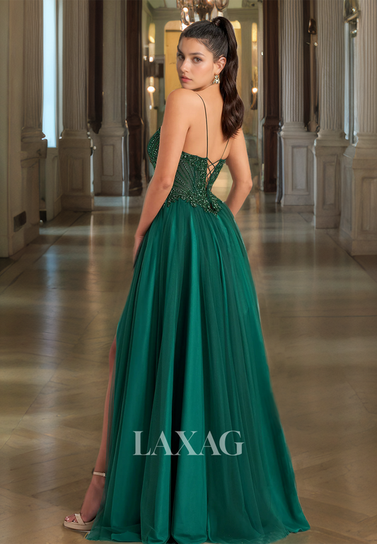 Spaghetti Straps V-Neck Tulle A-Line Prom Dress Sleeveless Beaded Pleated Sheer Formal Gowns