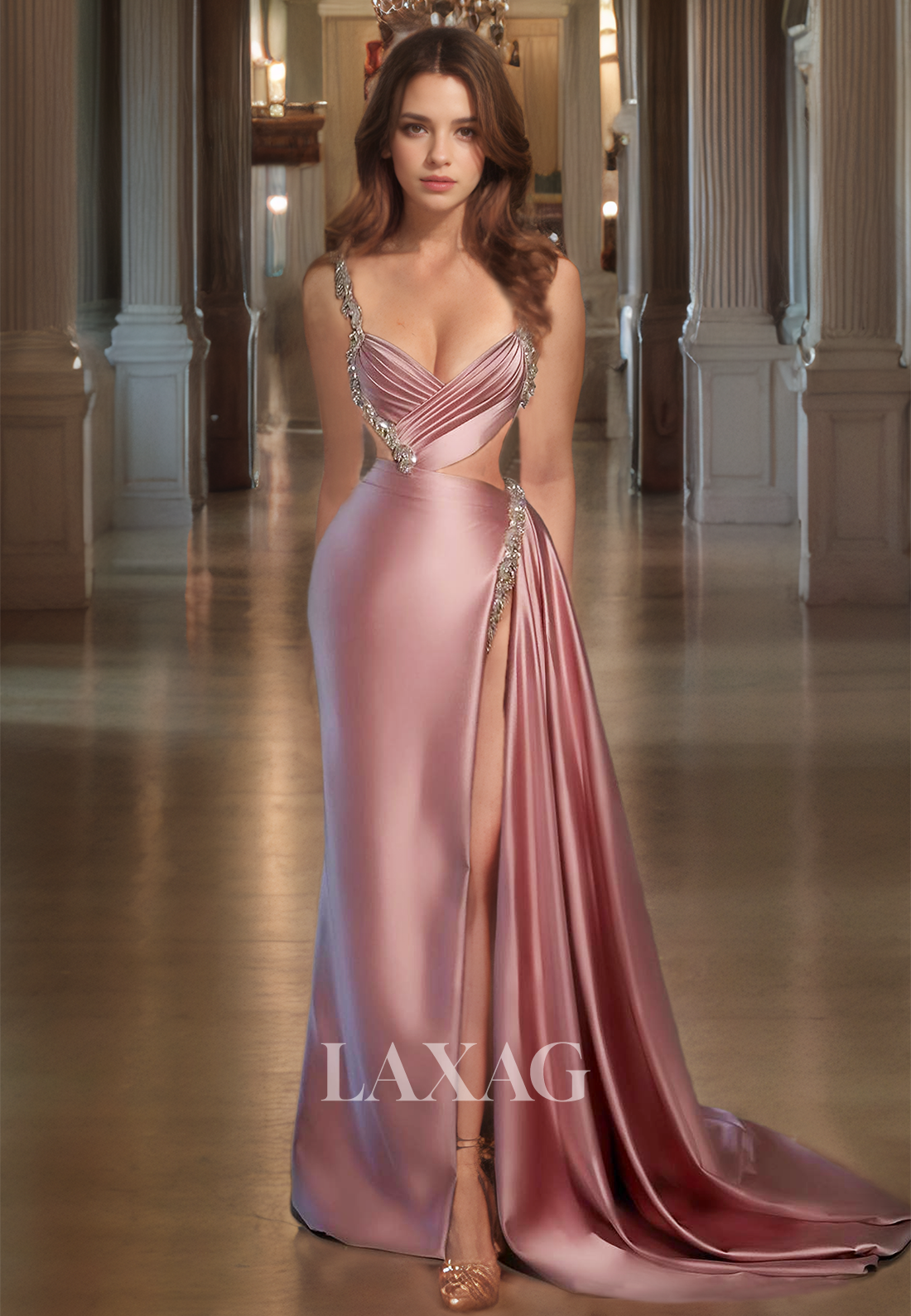 This stunning prom dress features a figure-flattering sweetheart neckline and a playful cutout design. Adorned with rhinestone sashes, this elegant dress is crafted from high-quality pleated satin and boasts a dramatic high slit. Perfect for any formal occasion, this dress is sure to turn heads.