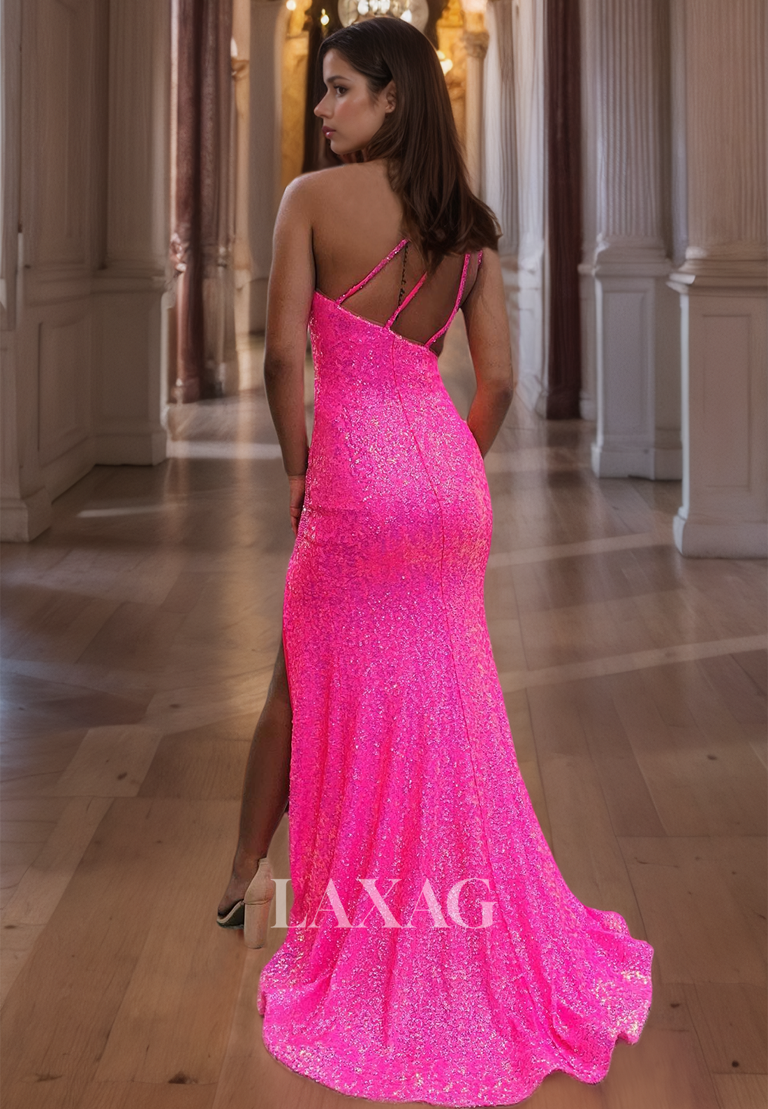 One Shoulder Sheath &Column Slit Prom Dress Classy Sparkly Long Formal Party Dress
