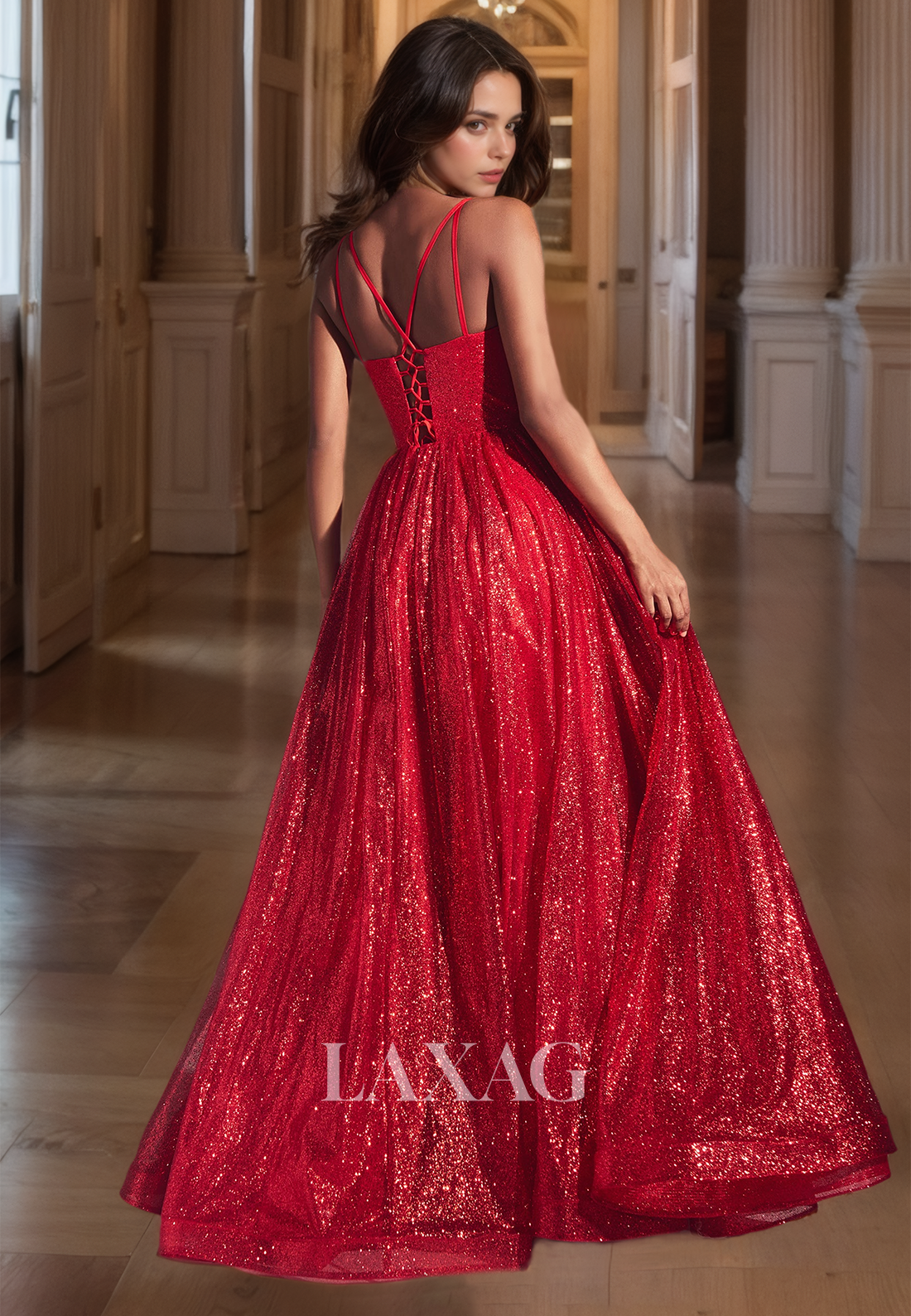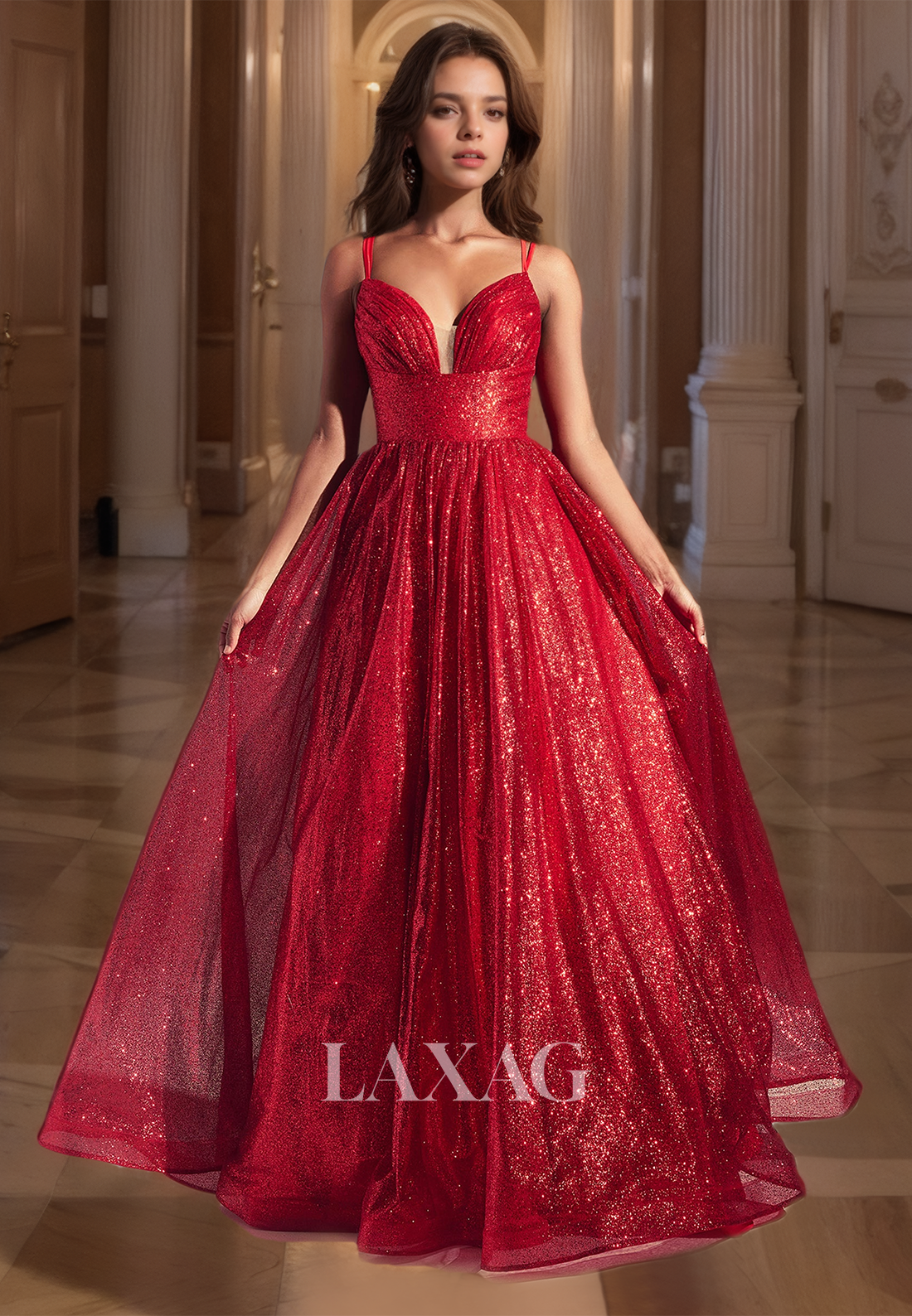 This A-line party dress features a stunning sweetheart neckline and spaghetti straps, adorned with shinny sequins in a mesmerizing red hue. Perfect for a prom or any special occasion, this dress will ensure you shine all night long.