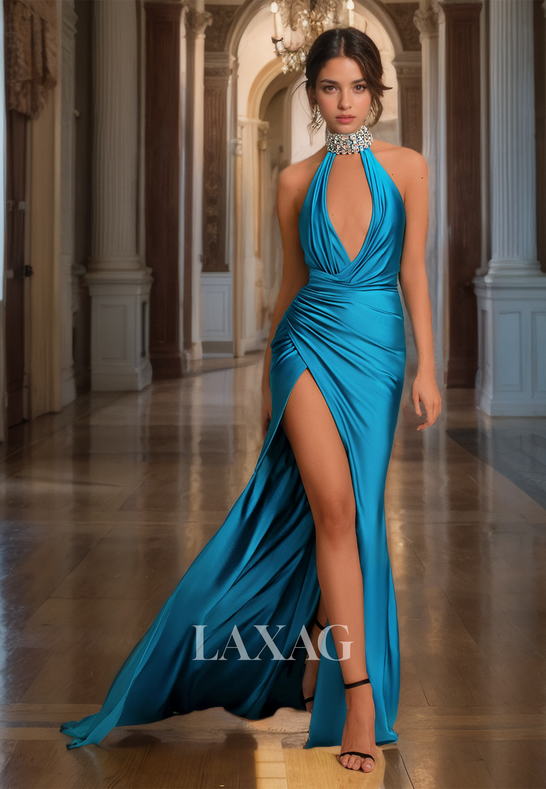 Beaded Halter Deep V-Neck Sleeveless Formal Gowns Pleated Floor-Length Mermaid Prom Dress