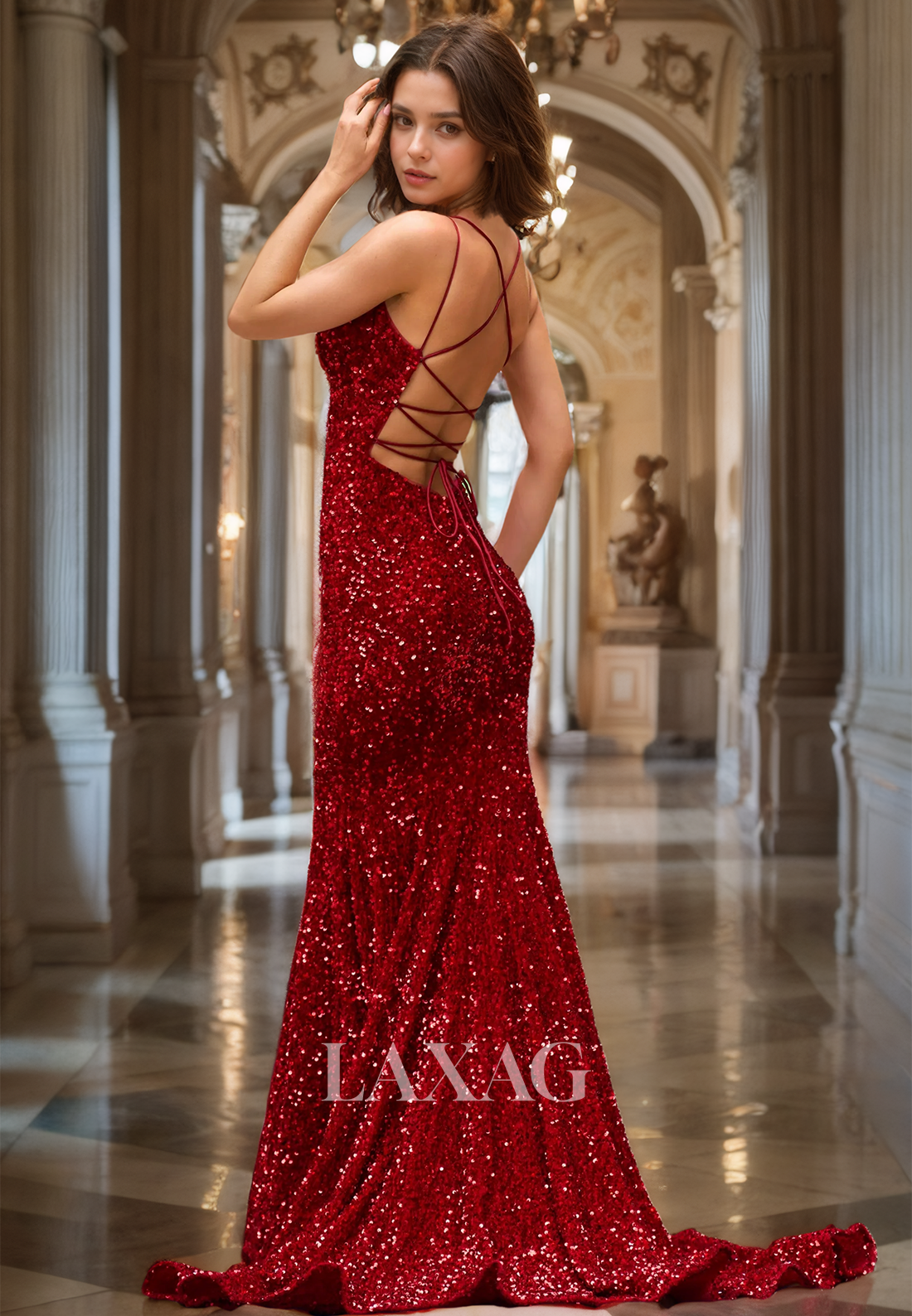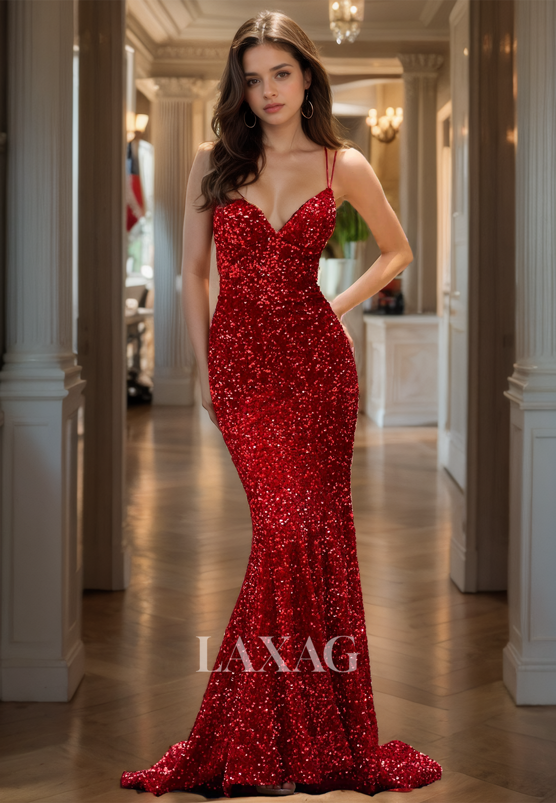 Allover Sequined Mermaid Prom Dress V-Neck Spaghetti Straps Sleeveless Evening Gowns with Train