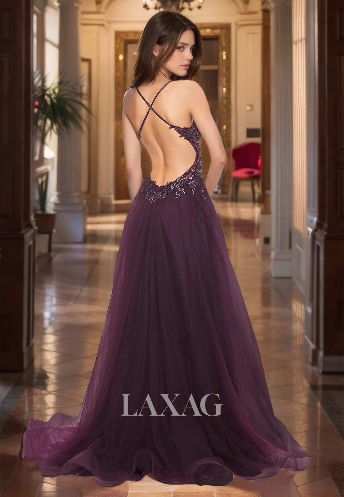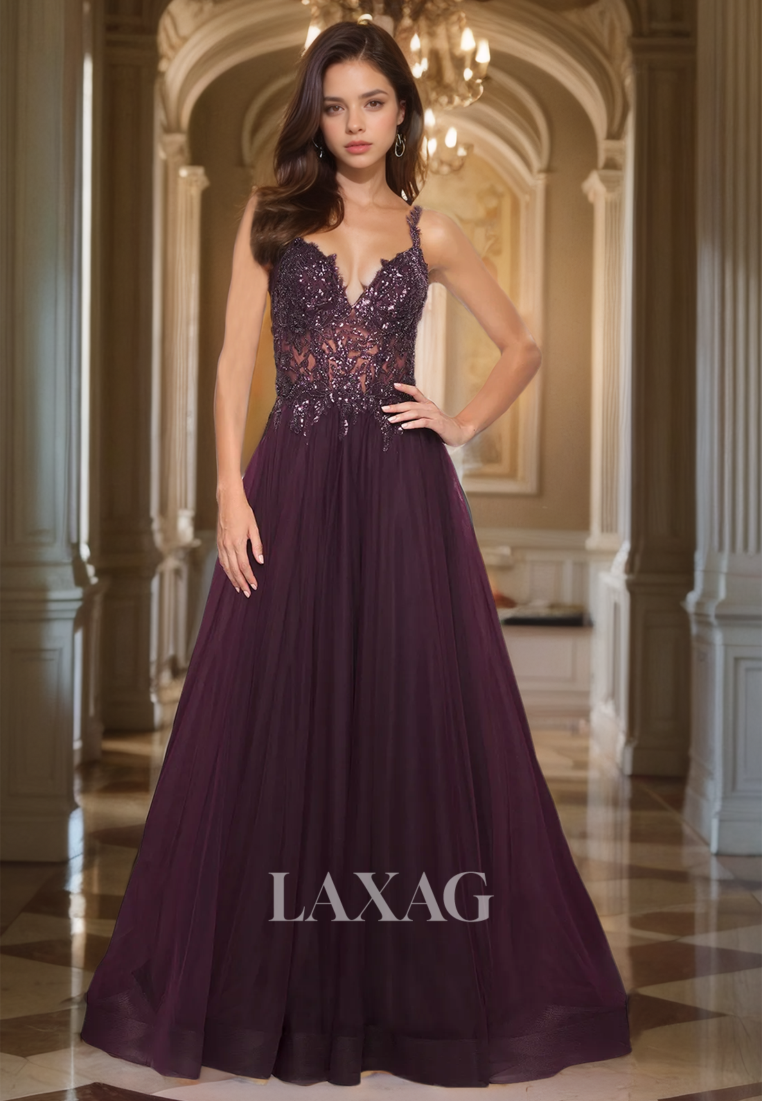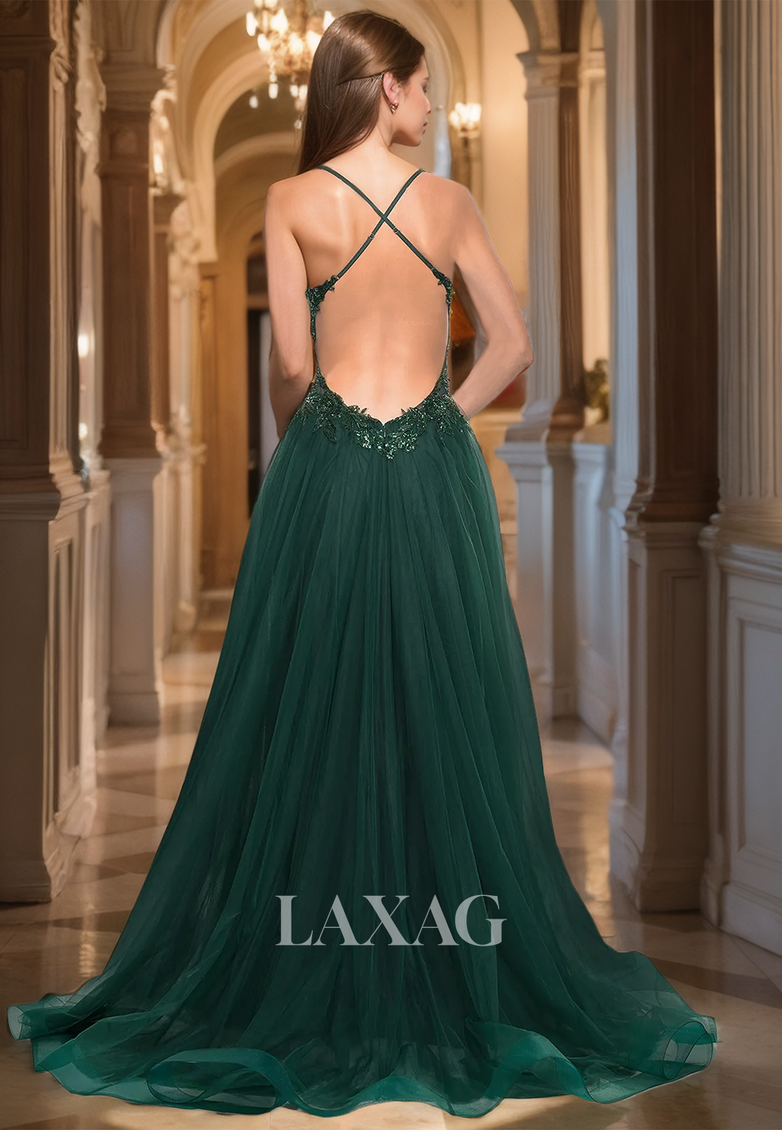 Spaghetti Straps Off-Shoulder Formal Gowns Deep V-Neck Applique Floor-Length A-Line Prom Dress with Beaded