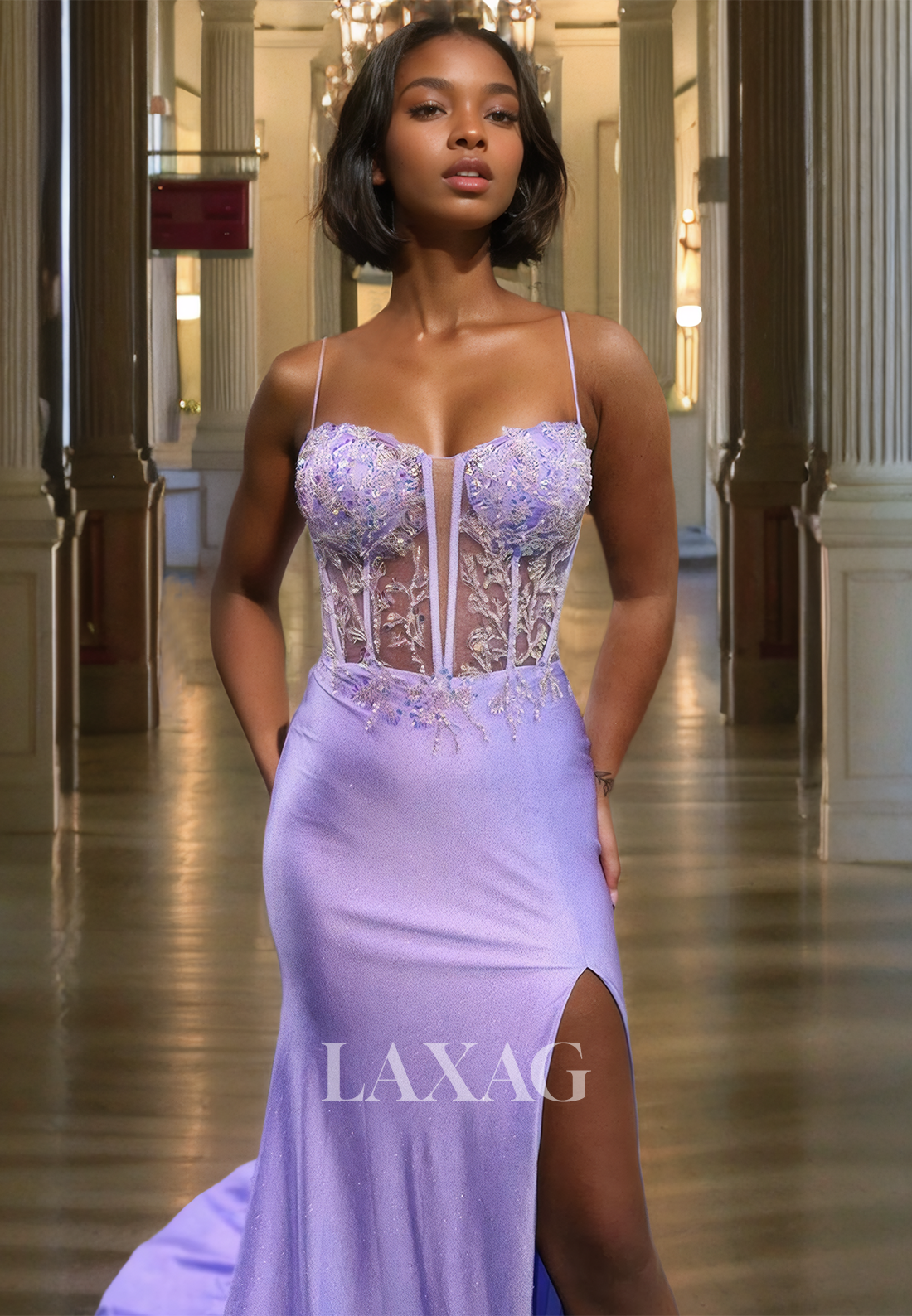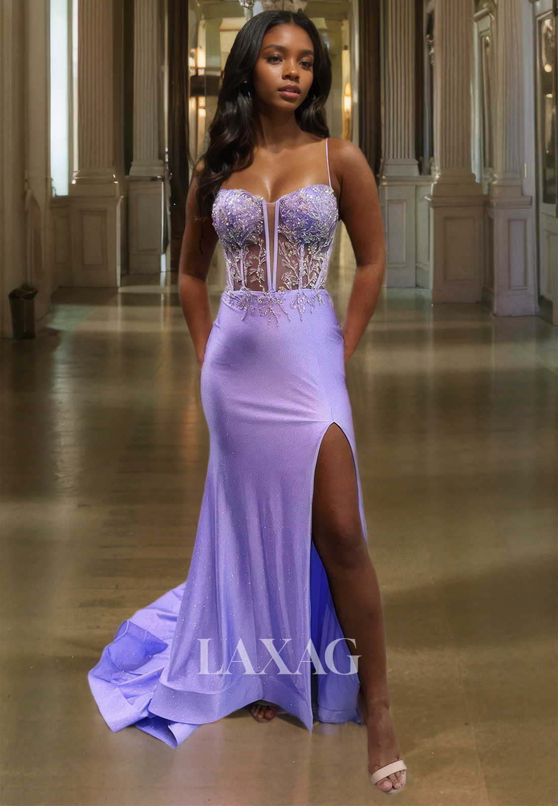 Glitter-Knit Applique Beaded Mermaid Prom Dress Sweetheart Spaghetti Straps Sleeveless Formal Dress with Slit