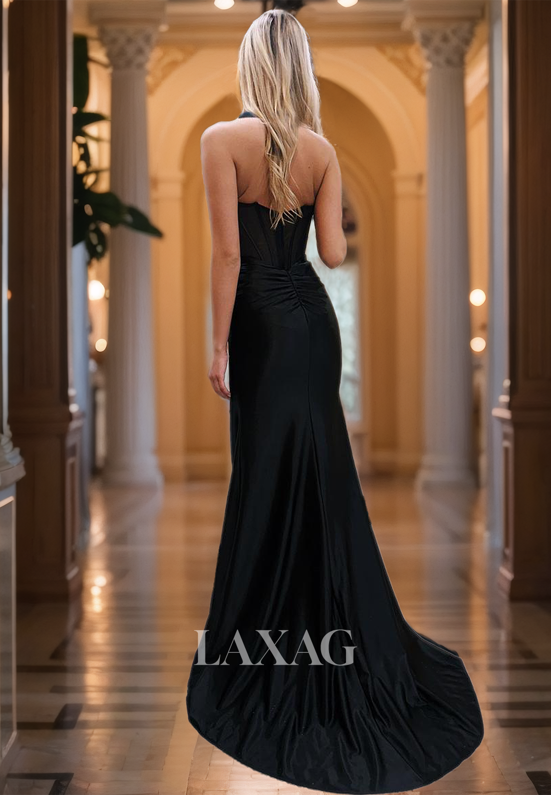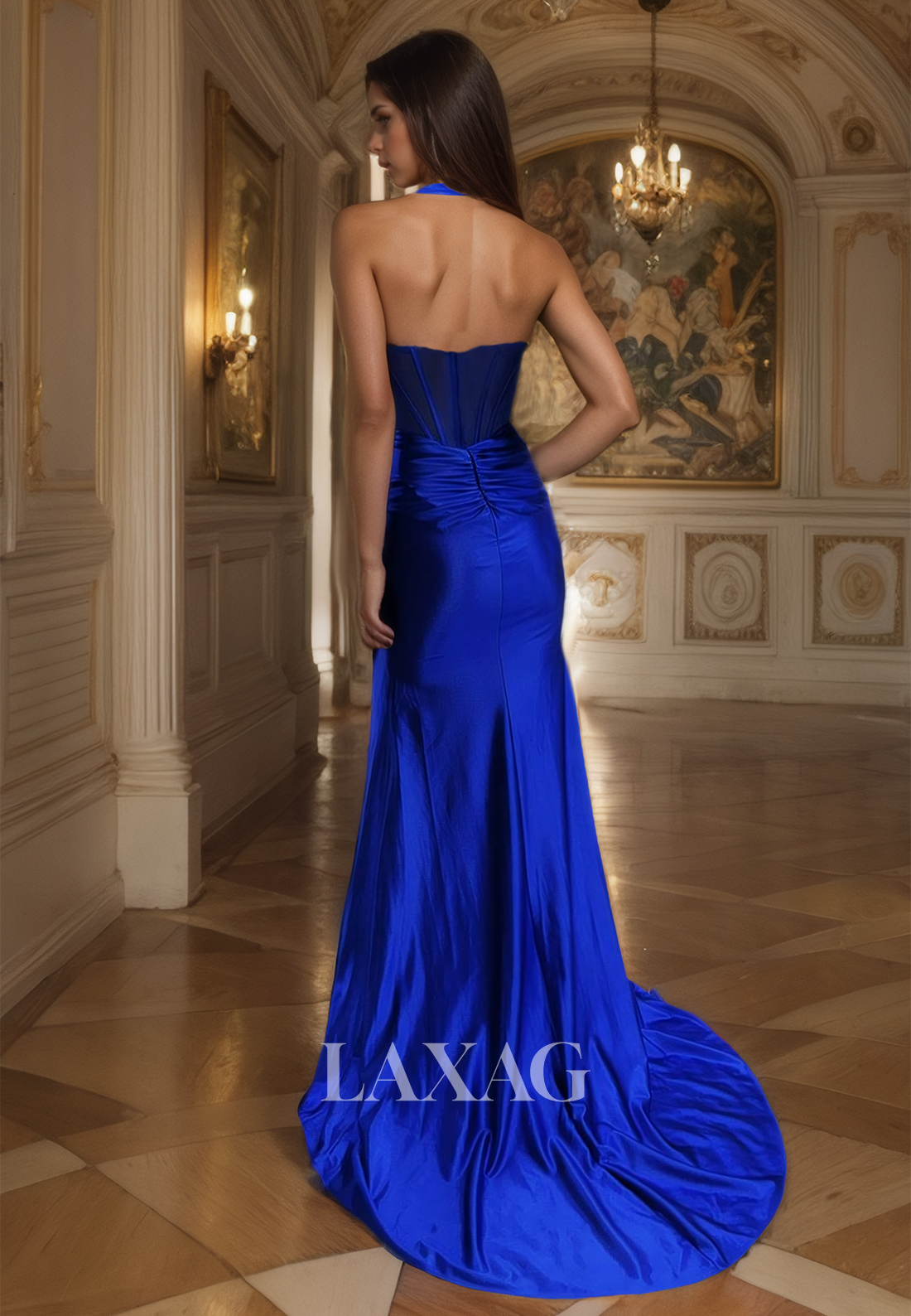Halter Deep V-Neck Off-Shoulder Sleeveless Pleated Slit Mermaid Prom Dress with Sweep Train