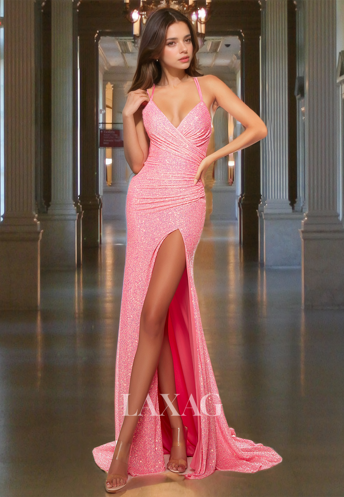 V-Neck Sleeveless Pleated Glitter-Knit Mermaid Prom Dress Spaghetti Straps High Slit Formal Gowns