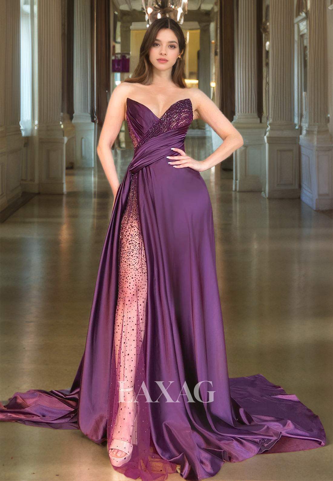 Elevate your evening look with our stunning V-Neck Sleeveless Beaded Lace Evening Gown. The glitter-knit fabric shimmers as you move, while the intricate lace detailing and beading add an elegant touch. Pleats flatter your figure, and a train adds a touch of drama. Perfect for prom or any special occasion.
