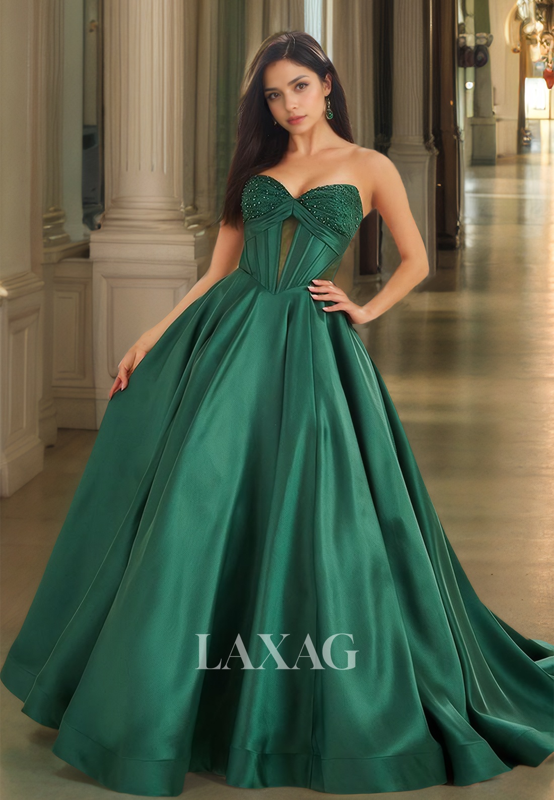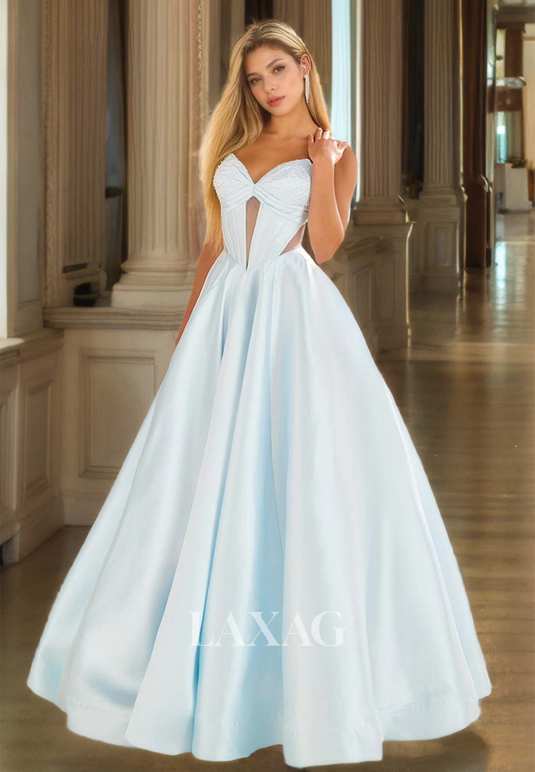 Beaded Sweetheart Off-Shoulder Cutout Formal Gowns Sleeveless Pleated Floor-Length A-Line Prom Dress
