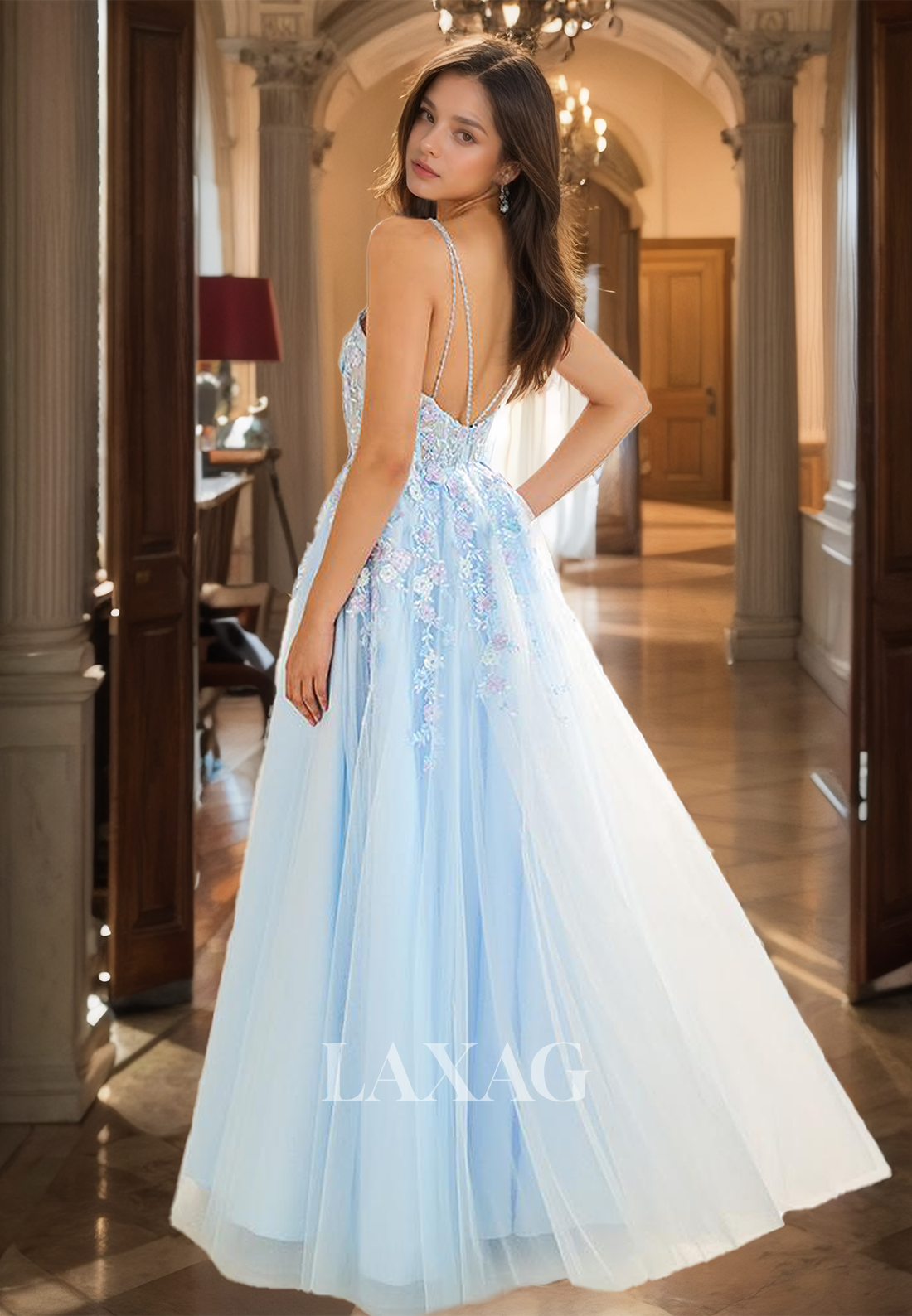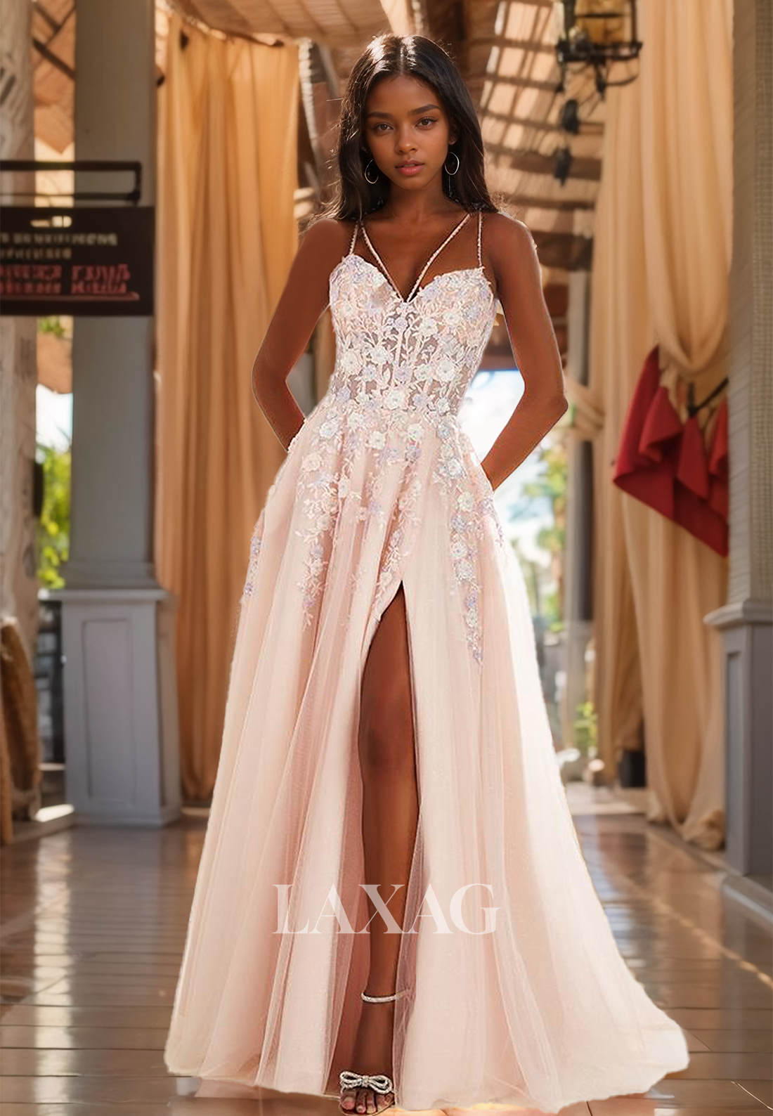 Sweetheart Off-Shoulder Floor-Lenght A-Line Prom Dress Spaghetti Straps Sleeveless Applique Formal Dress