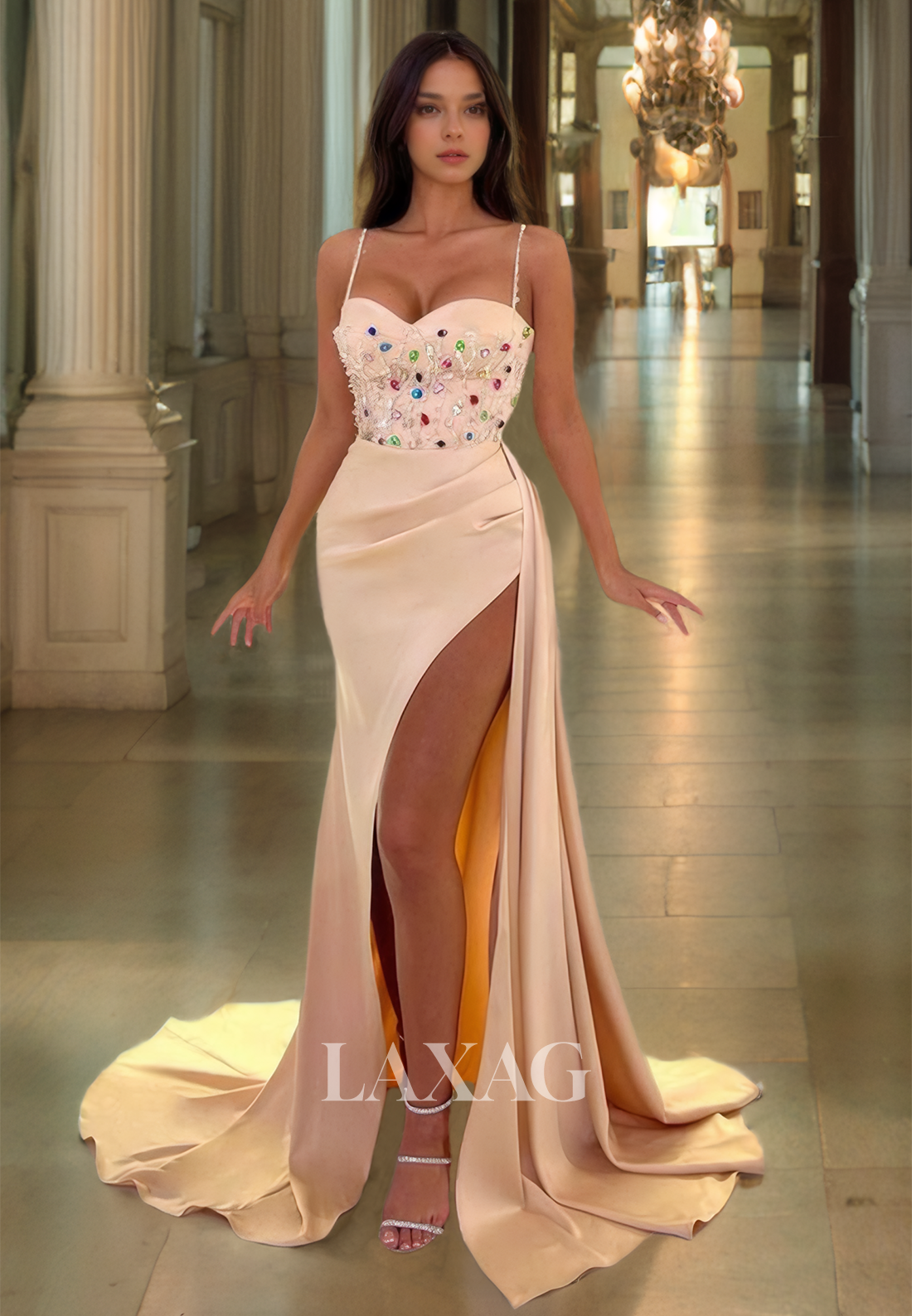 Spaghetti Straps Sleeveless Pleated Evening Gowns Sweetheart Colorful Rhinestone Slit Train Prom Dress