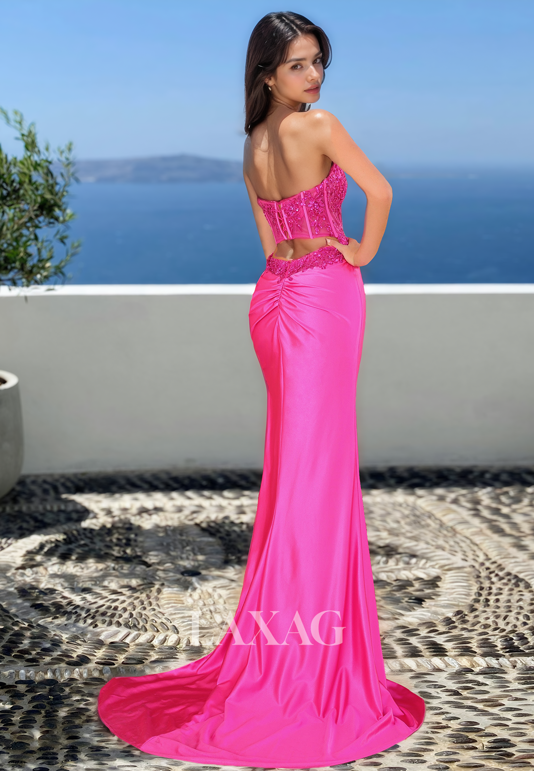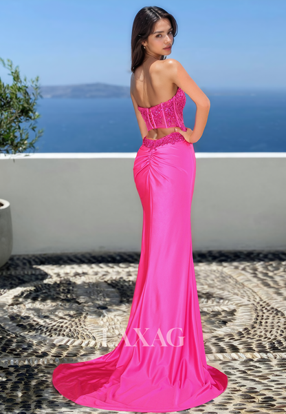 Scoop-Neck Off-Shoulder Sleeveless Satin Mermaid Prom Dress Beaded Sequined Applique Evening Dress