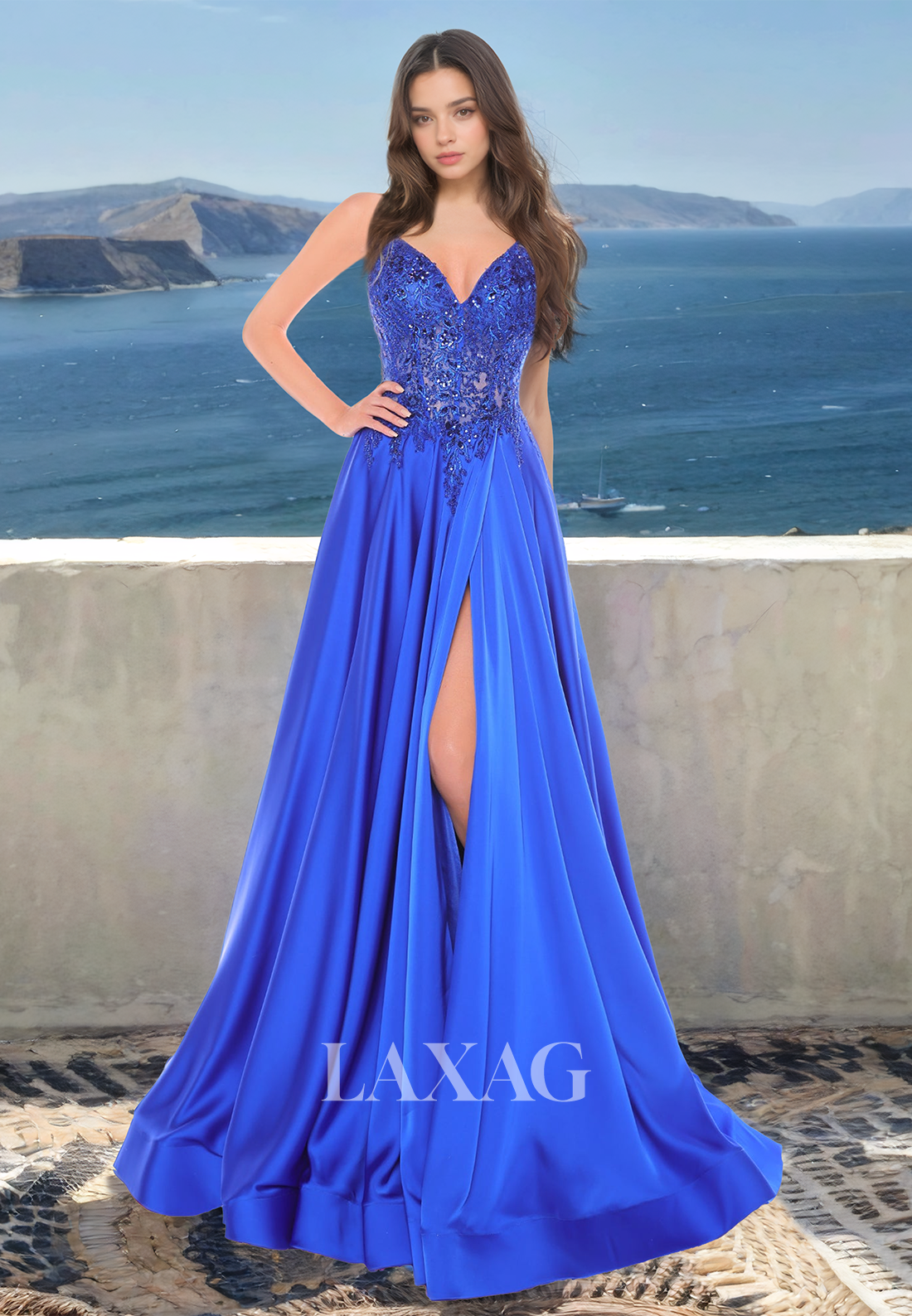 V-Neck Spaghetti Straps Sleeveless A-Line Prom Dress Beaded Sequined Applique Satin Party Gowns