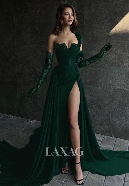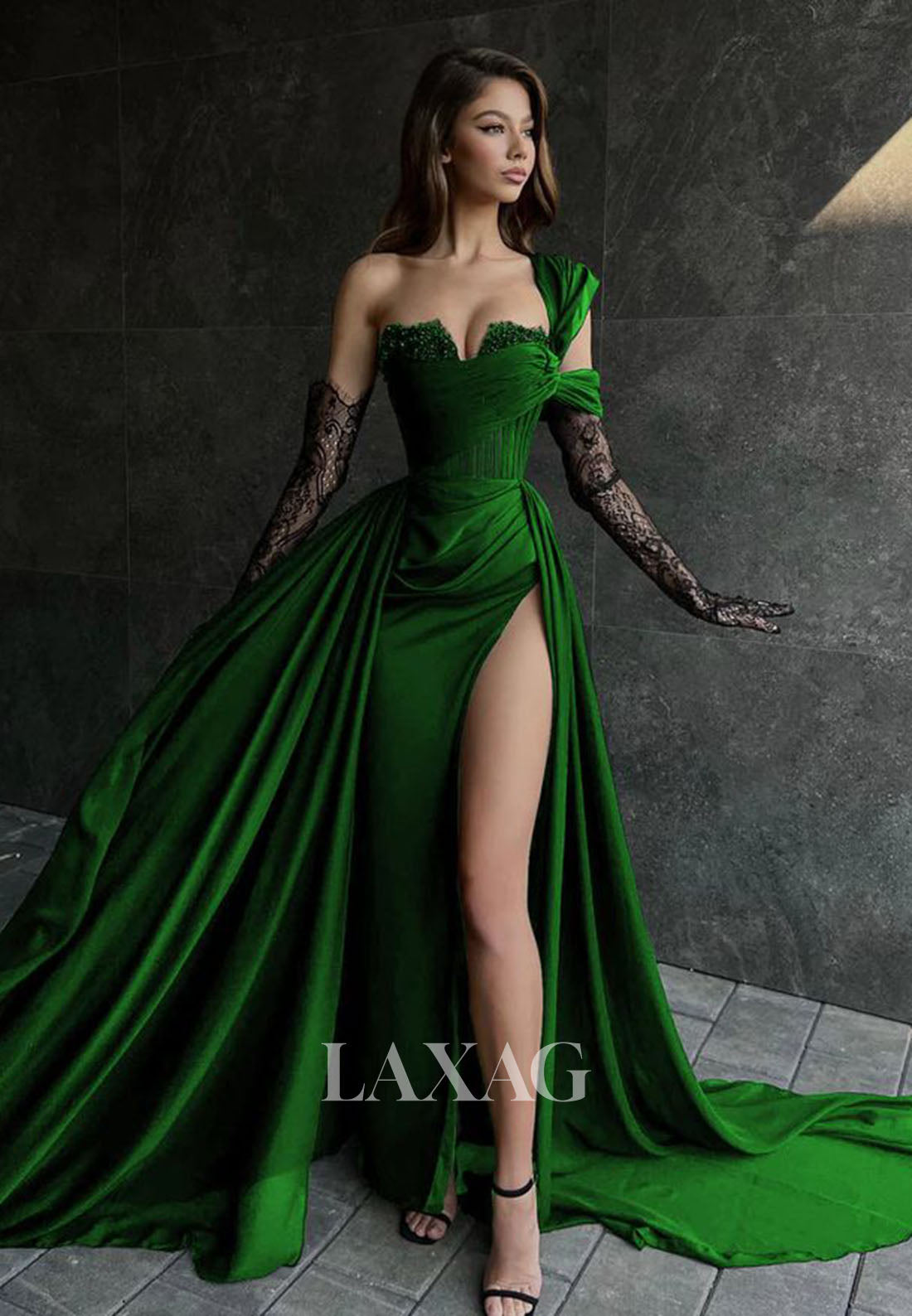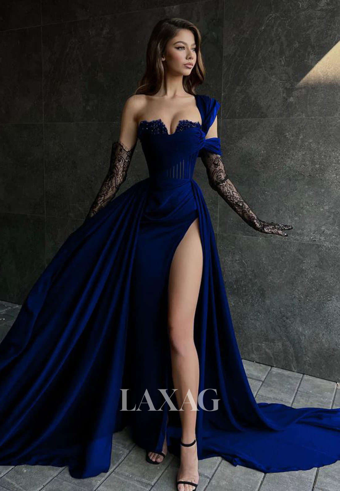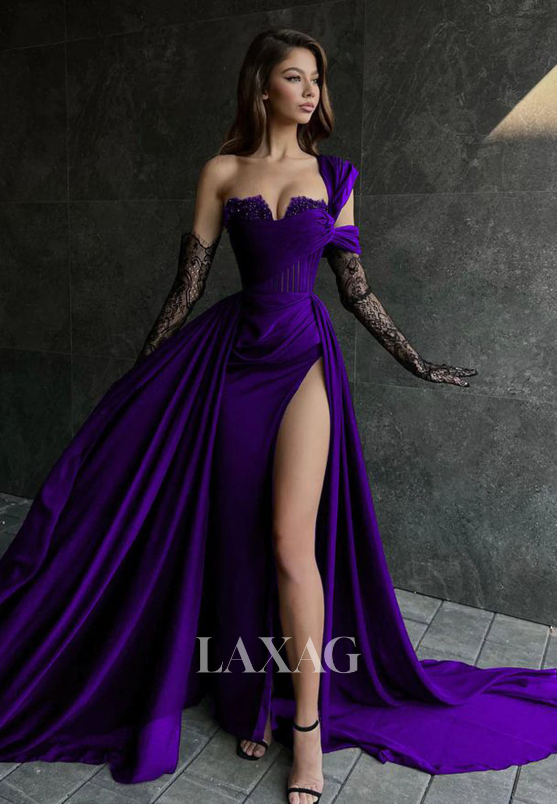 Sweetheart Off-Shoulder Pleated Evening Gowns Lace Gloves Beaded High Slit A-Line Prom Dress