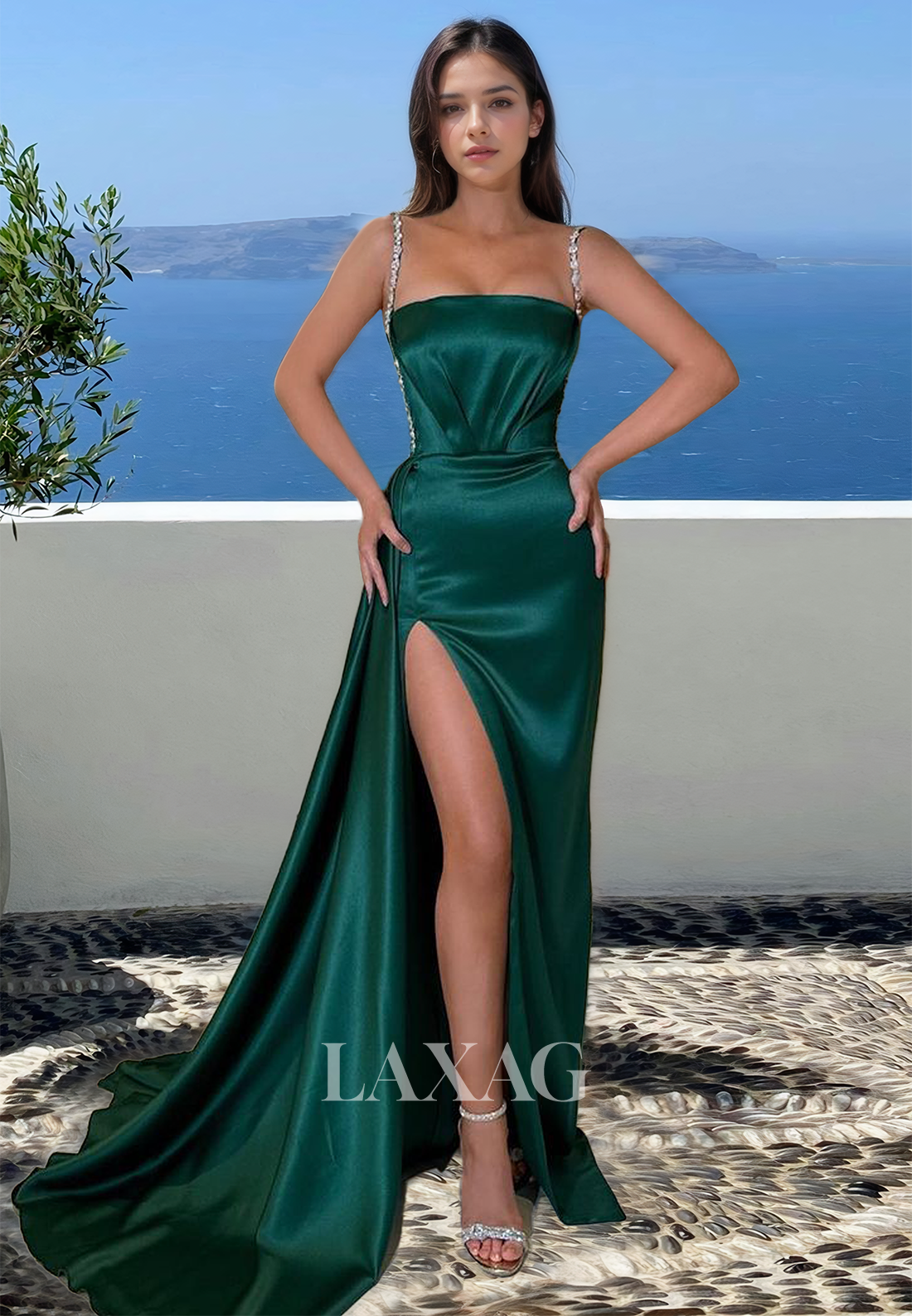 Beaded Spaghetti Straps Sleeveless Satin Party Gowns Tube Top Off-Shoulder Pleated Mermaid Prom Dress
